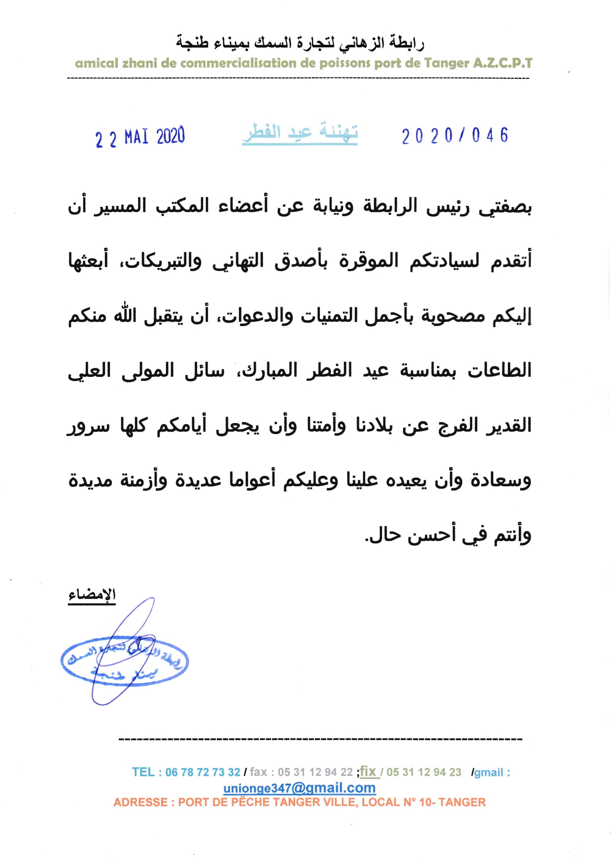 تهنئة بمناسبة عيد الفطر المبارك من “رابطة الزهاني لتجارة السمك بميناء طنجة “ 23 مايو، 2020 الماء والمحيط, سلايدر اضف تعليق مادة اعلانية- البحر24