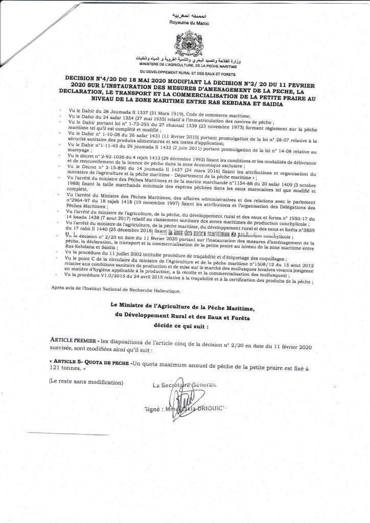 و كان رؤساء التعاونيات والجمعيات المهنية بالمنطقة، عبروا عن محدودية نشاط صيد “الصدفيات” نوع ( petite praire) ، وذلك بسبب قلة الحصة السنوية المتمثلة في 110 طن والمخصصة ل200 قارب معني بصيد هذا النوع من الصدفيات، بحيث ان معدل صيد كل قارب لا يتعدى معدل 440 كلغ لكل وحدة.