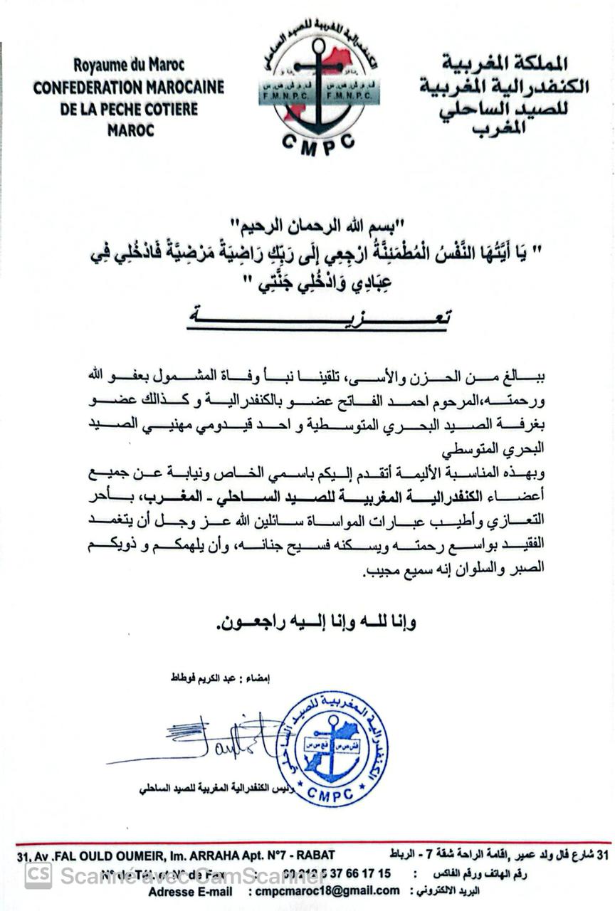 على إثر المصاب الجلل td وفاة أحمد الفاتح عضو الكنفدرالية المغربية للصيد الساحلي، وعضو غرفة الصيد البحري المتوسطية وأحد قيدومي مهنيي الصيد البحري، يتقدم السيد عبد الكريم فوطاط رئيس الكنفدرالية المغربية للصيد الساحلي، أصالة عن نفسه ونيابة عن كافة السادة أعضاء الكنفدرالية بأحر التعازي وأطيب عبارات المواساة ، وهذا نص التعزية الكامل:
