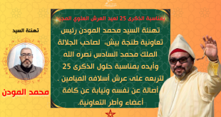 بمناسبة الذكرى 25 لعيد العرش العلوي المجيد، يتشرف خديمكم المطيع السيد محمد المودن، رئيس رابطة الزهاني لتجارة السمك بميناء طنجة، أصالة عن نفسه ونيابة عن كافة أعضاء وأطر الرابطة، بأسمى عبارات الإجلال والتقدير والمتمنيات، المقرونة بأصدق فروض الطاعة والامتثال والتشبث المتين بأهداب العرش العلوي المجيد، سائلا العلي القدير أن يديم …